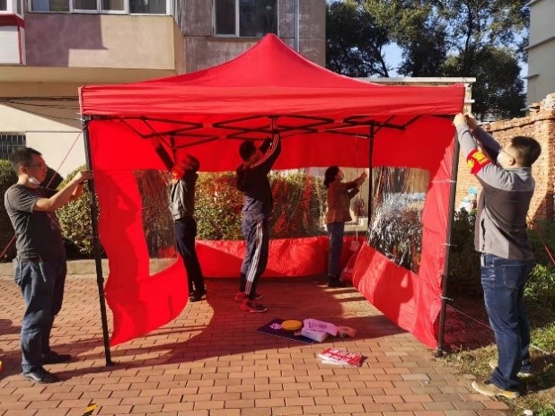 在全員核酸檢測時,工力所社區居民多已年長,部分人員身體狀況不佳,長時間排隊情緒容易焦躁,體力也吃不消。對此,現場工作組積極協調,第一時間為社區提供塑料座椅,供居民臨時休息。現場工作人員長時間指揮嗓子干啞,支部立即調配擴音器、引導線等,輔助維持現場秩序。聞息近期有雨,又緊急增配雨衣,以免影響檢測工作。接到第四輪核酸檢測點遷移指令后,工作組又緊急集結,在居民區空地搭設帳篷,設置排隊引導線、隔離樁,調試設備設施,有效保證核酸檢測工作順利進行。