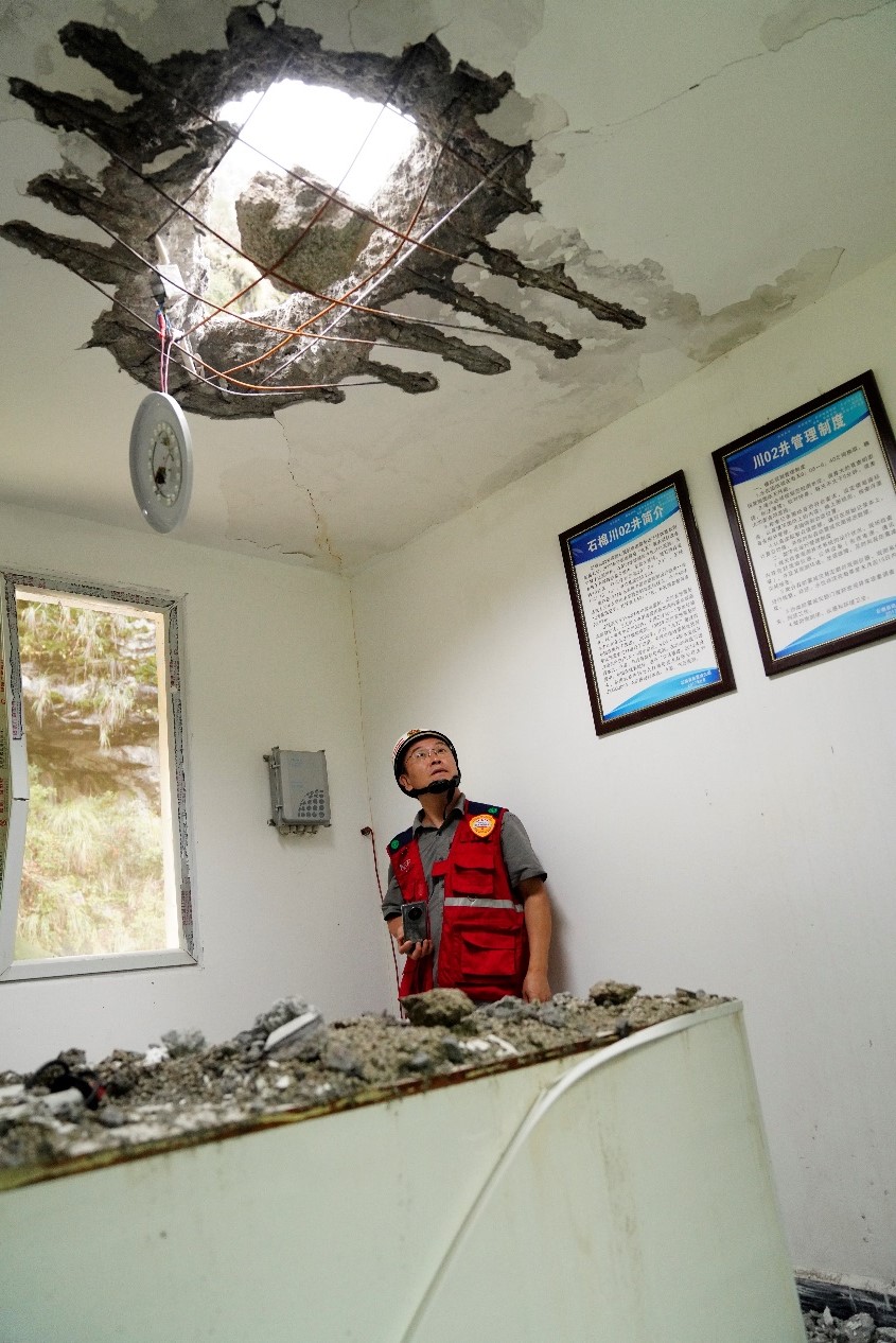 石棉線科考組圍繞石棉川02井、擦羅強震臺站、栗子坪強震臺站開展了周邊建筑震害調(diào)查。該區(qū)域儀器烈度與實際建筑破壞程度基本相符,考察區(qū)域的大部分震害為非結(jié)構(gòu)構(gòu)件的破壞,如框架結(jié)構(gòu)填充墻開裂、瓷磚脫落等。科考組考察到的2008年汶川地震后援建的中小學(xué)校舍在此次地震中表現(xiàn)良好,幾無震害。個別房屋出現(xiàn)了屋蓋和墻壁被落石直接擊穿的震害。
